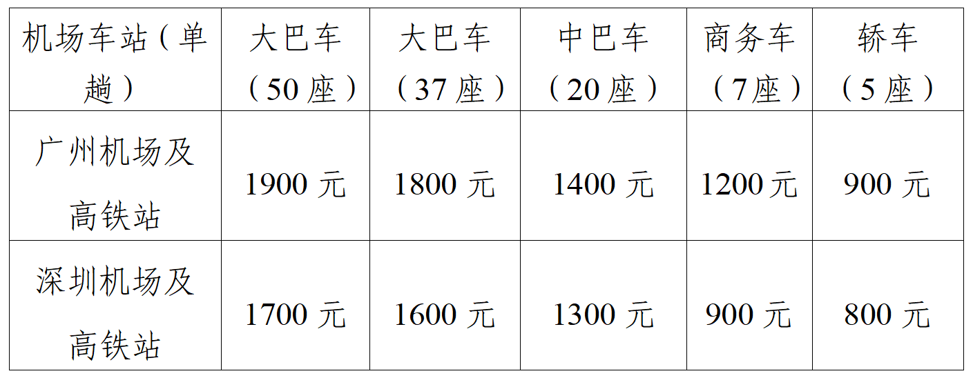 2.交通中轉保障。參賽單位原則上從始發(fā)地直達惠州賽區(qū),不在廣州、深圳賽區(qū)經(jīng)停和中轉。確需在廣州、深圳賽區(qū)轉換交通工具前往惠州賽區(qū)的,可在抵惠前10天與滑板競委會工作人員聯(lián)系,提供迎送站信息。費用標準如下:
